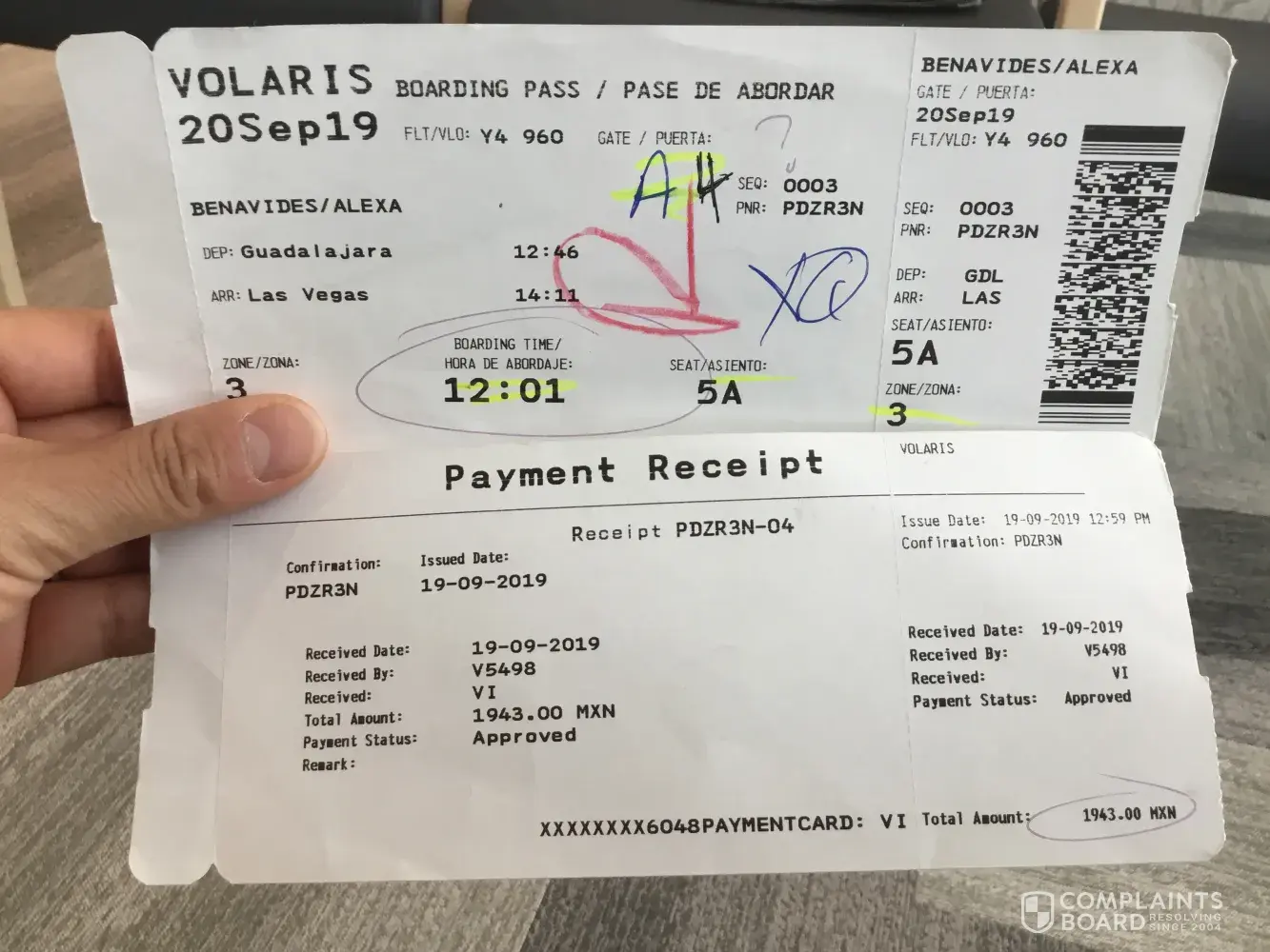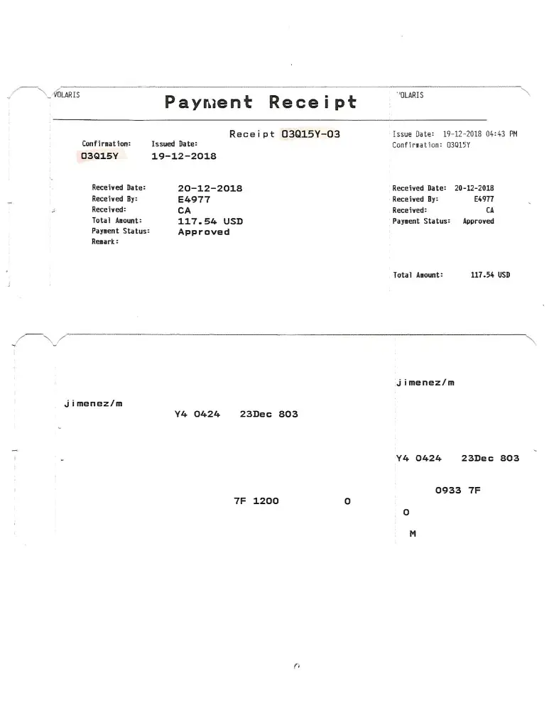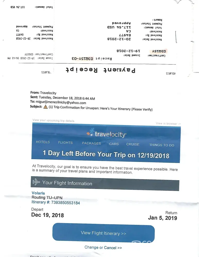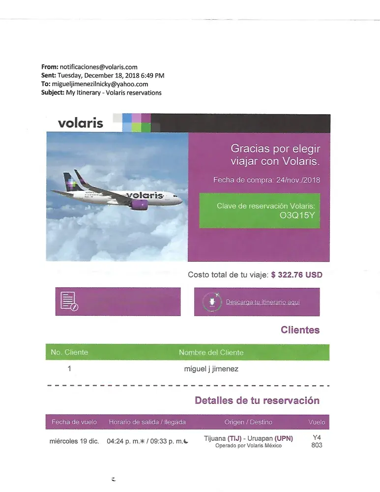 I have attached the last email confirmation that Volaris sent me. I would be happy to provide you with proof of our wages and the resort cost if we do not come to an amicable agreement. I am expecting a full refund of our return flight cost.