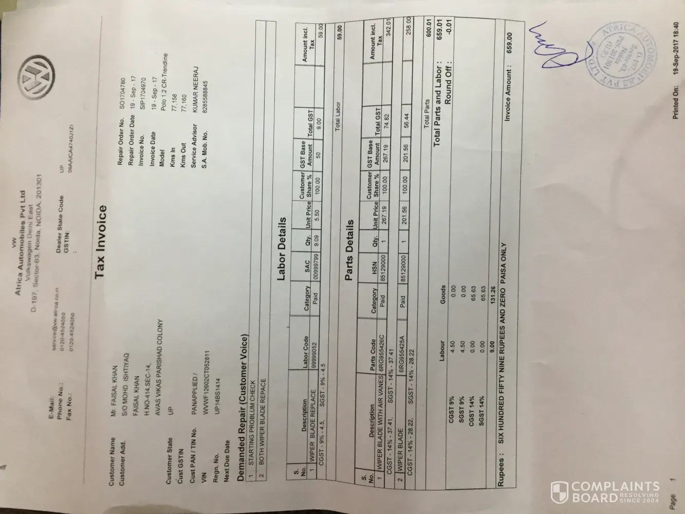 I have just got an invoice of a wiper blades replacement.nothing mentioned about the battery replacement. kindly look into the matter seriously.