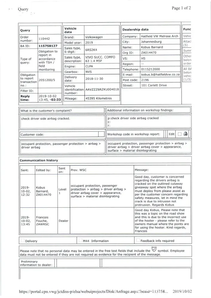 0738524833/0798934131 this matter should be address asp before 31/07/2019 because i have proove of many clients who had same problem but being assisted but because my son was working there i am not assisted this is directed to trevor. the is prove A7 silver had same problem but client assisted and there is also prove of the jetta tsi silver as well.
