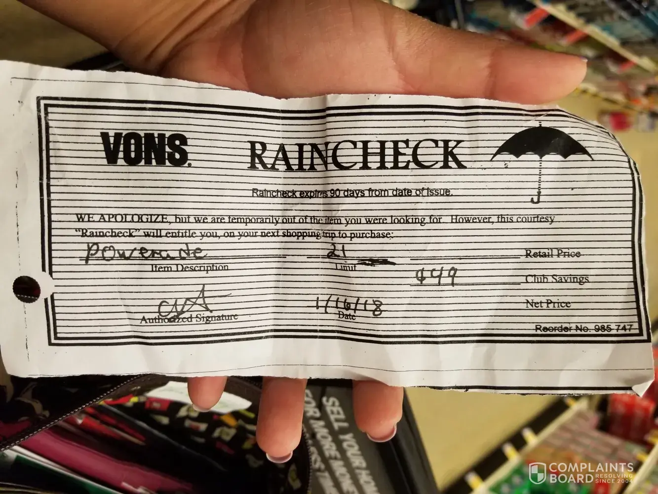 About a month ago, my grandma received a rain check from the Glendale location on Los Feliz Rd. for Powerade, which was on sale for $0.49 at the time. She tried to use it at the Arcadia location on 2/16/18 and the manager there informed us that it is against policy to allow my grandma to purchase 21 Powerades even though it was written on the rain check and signed by a manager. I believe her name was Letty and she allowed us to get at least 10. She wrote instructions for whomever checked us out and signed it. We proceeded to the registers to check out and the cashier, Rey, did not believe anything we said even though we gave the manager's name and showed that she signed the back of our rain check. He was extremely rude and continued to give my grandma attitude and tried to blame us for the rain check, which happened to be a copy (because the Glendale store had apparently run out of rain checks at the time). At that moment I stepped in because customer service skills were lacking in that he was raising his voice at my grandma. I instructed him to simply charge us regular price so that we can just leave. I now go to the Pasadena location on Colorado because their customer service is pleasantly better. I have attached a picture of the rain check attained by the Glendale location.