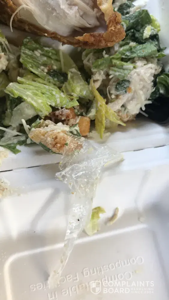 I Went to your Vons Store # 2326 location 780 N. Brea Blvd Ca Brea 92621 and ordered a hot combo meal with a chicken breast drumstick and two sides of chicken Cesar salad. While I was eating my food I see that there is this large piece of what seems to be glove plastic in my salad. It is disgusting first of all and a chocking hazard has I actually not noticed and ate it. I am complaining for your staff not taking careful precaution in preparing your food item. This little mistake could have easily become a big mistake had I missed the plastic.