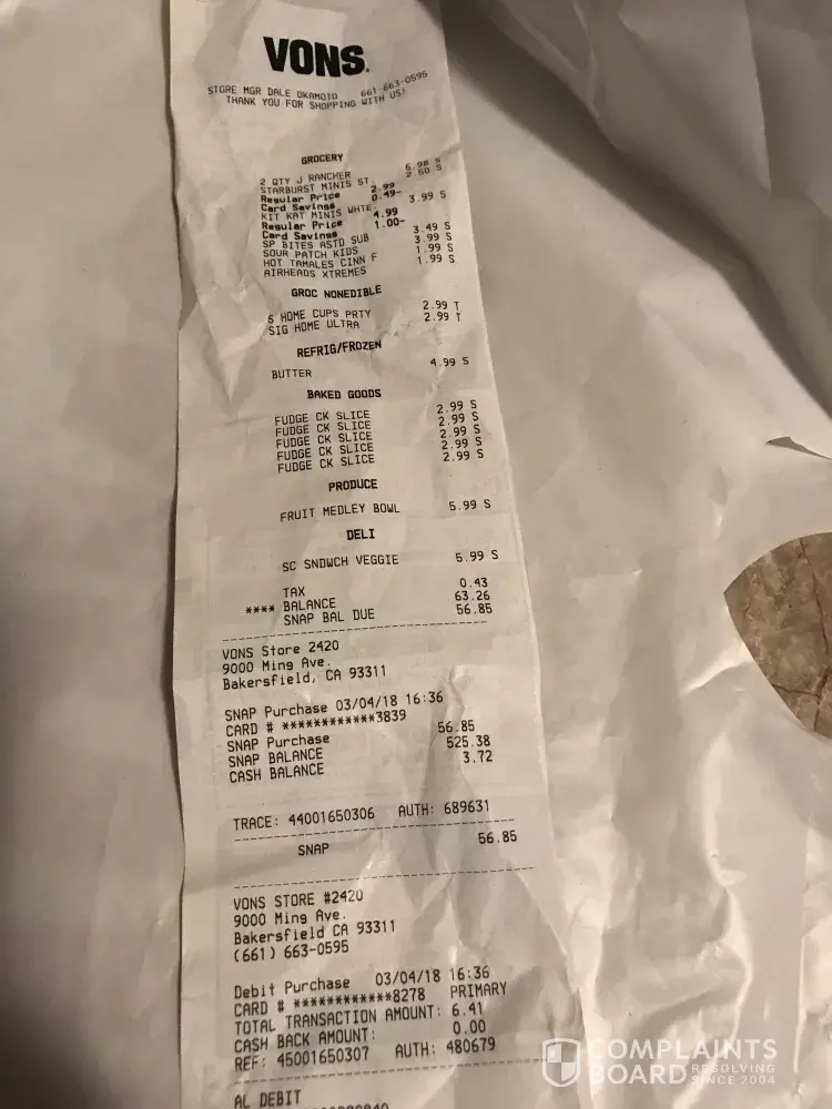 vons should never treat a person that way, the security were very bias, and the cashier was very not trained and should have better judgment she was at wrong here and made things why wrong and because of the way she handled this satiation very poorly and to have your live under threat