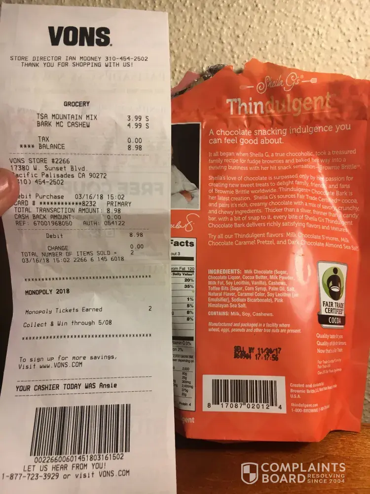 The candy was on the shelf and sold to me (customer) 5 months after Sell by date from store 2266 Pacific Palisades. I ate some before looking at package, I'm discusted. I sent a photo of receipt and product to distributor, manufacture. I want a full refund, and an apology from someone at Vons. I have never been so appalled at something so blatant. A lack of store detail needs to be addressed.