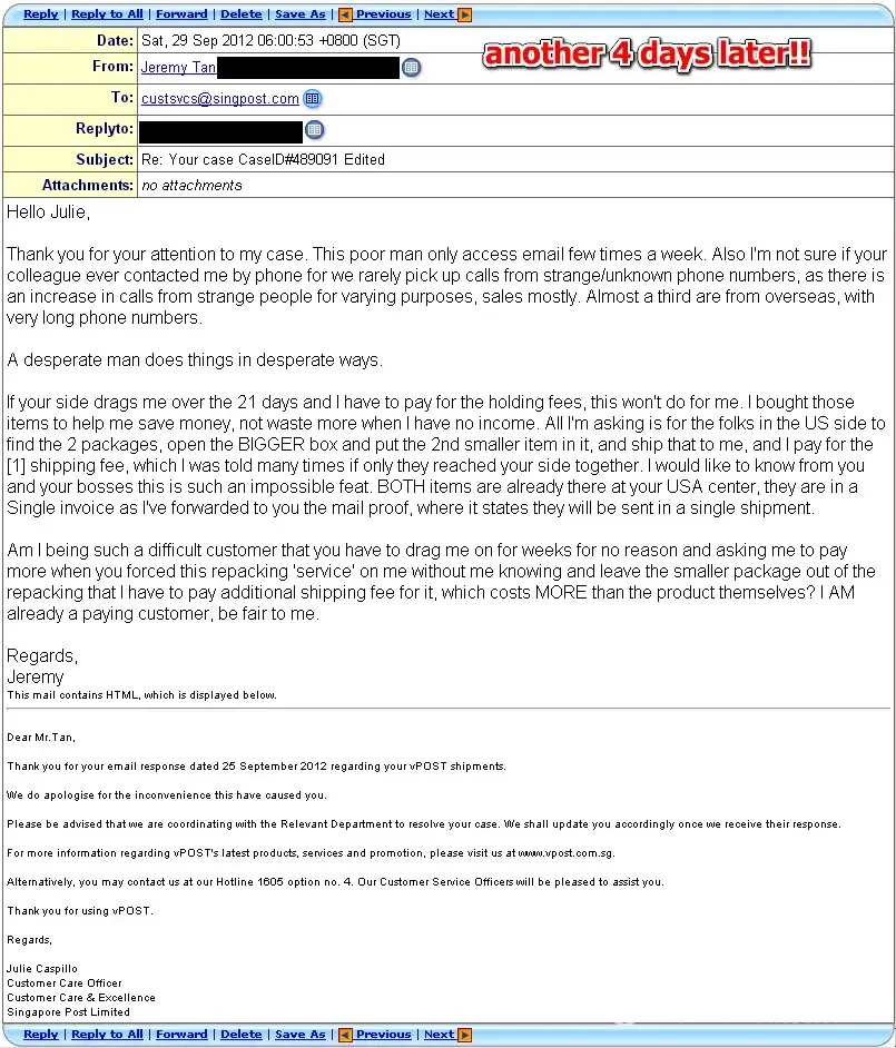 I am a regular online buyer for the past 5 years and has been actively purchasing and shipping items from amazon us and ebay us. I have been a loyal vpost customer using their forwarding service to have my items shipped from their us address to singapore for the past years. There are some hiccups here and there from time to time and I tried to bear with them until this recent transaction which is deemed intolerable.