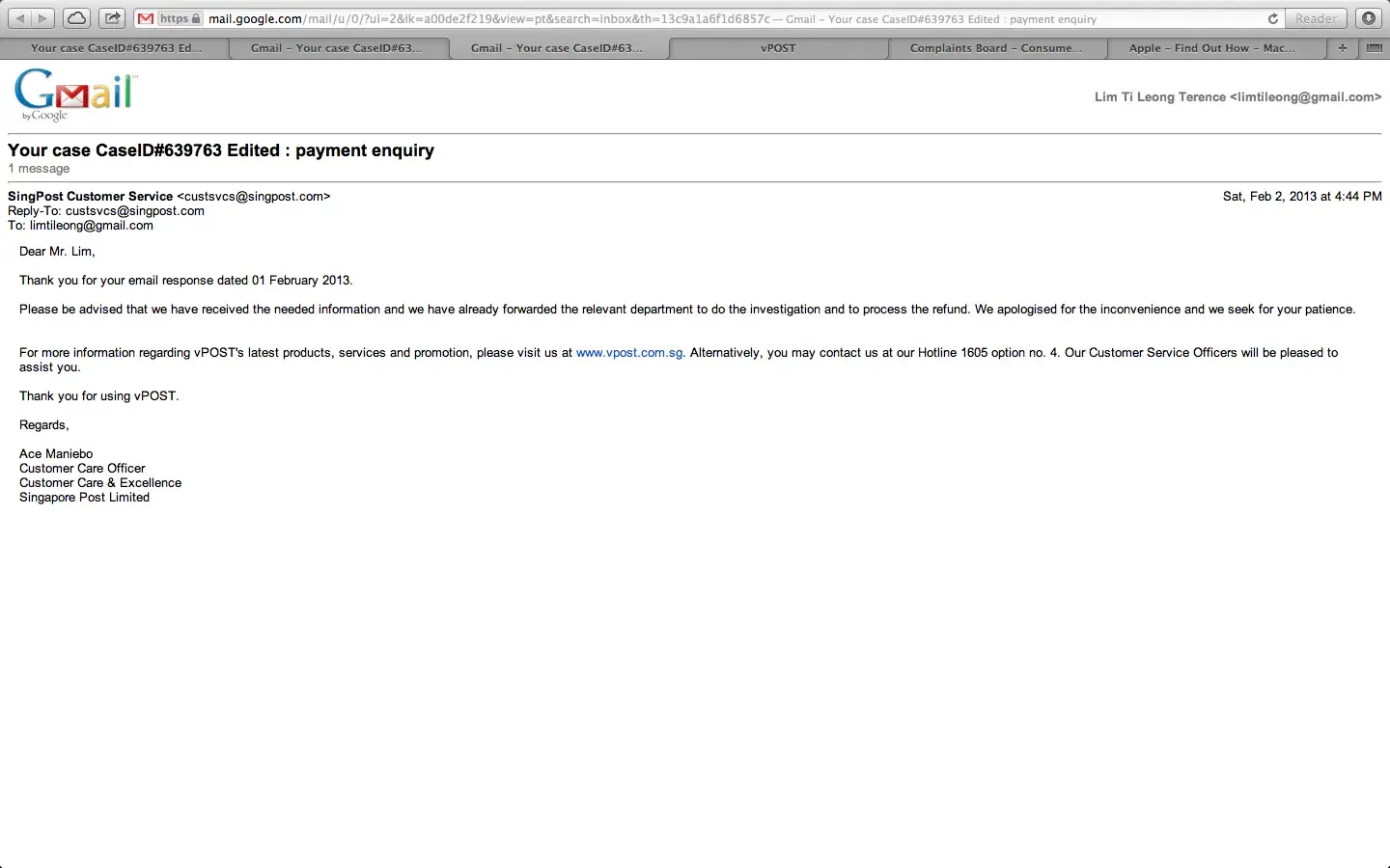 5 Dec - Called 1605 for vPost to enquire about my packages. Spoke to the supervisor Vikas. He told me that he is not able to find my vPost account SG-3000-913X . My heart almost stopped. He requested me to send him all the invoices and the emails from vPost to confirm the registration of SG-3000-913X . Sent him all the required documents.