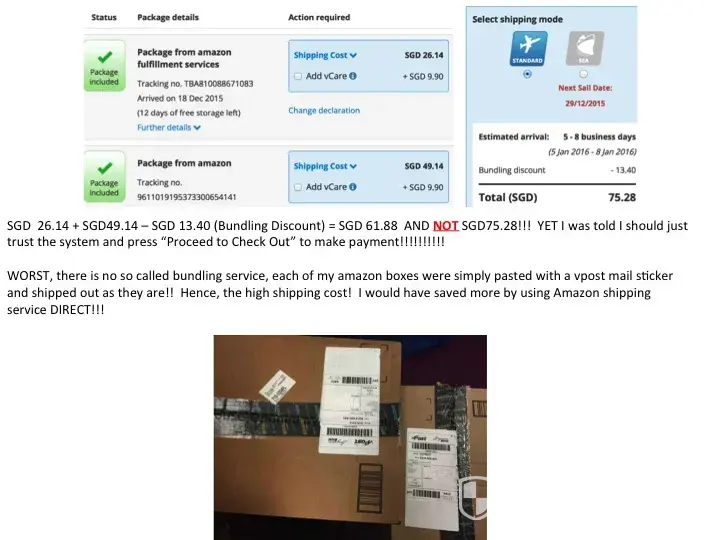 Folks, Vpost is the absolute worst parcel forwarding service EVER and I have used a few such service in my more than 5 years of purchasing stuff from the USA. Despite repeated email and phone discussion with Vpost staff, they were not able nor willing to help or answer my questions, point-by-point, except to cut-and-paste some standard statements that do not answer the stated issues. Let me just sum up into 2 issue to cut the long story short: 1) WRONG reflection of total shipping cost and yet expected the customer to proceed to check out to make payment. The staff simply asked me to trust the system when I pointed out that : SGD 26.14 + SGD49.14 – SGD 13.40 (Bundling Discount) = SGD 61.88 and NOT SGD75.28! By then, you were being held ransom as your packages had already been shipped to vpost's virtual address ! Can you afford not to proceed ? 2) There was NO bundling service at vpost's virtual address. vpost simply pasted the vpost sticker on top of my Amazon boxes and shipped them as they are! It's CHEAPER to use Amazon's shipping service DIRECT! Please refer to my attached JPG for visual evidence of vpost's lousy sub standard 3rd class forwarding disservice. Word of caution: You will regret for using vpost. I have. Google and do your online research, you can definitely find a better forwarding service than vpost, ANYTIME!