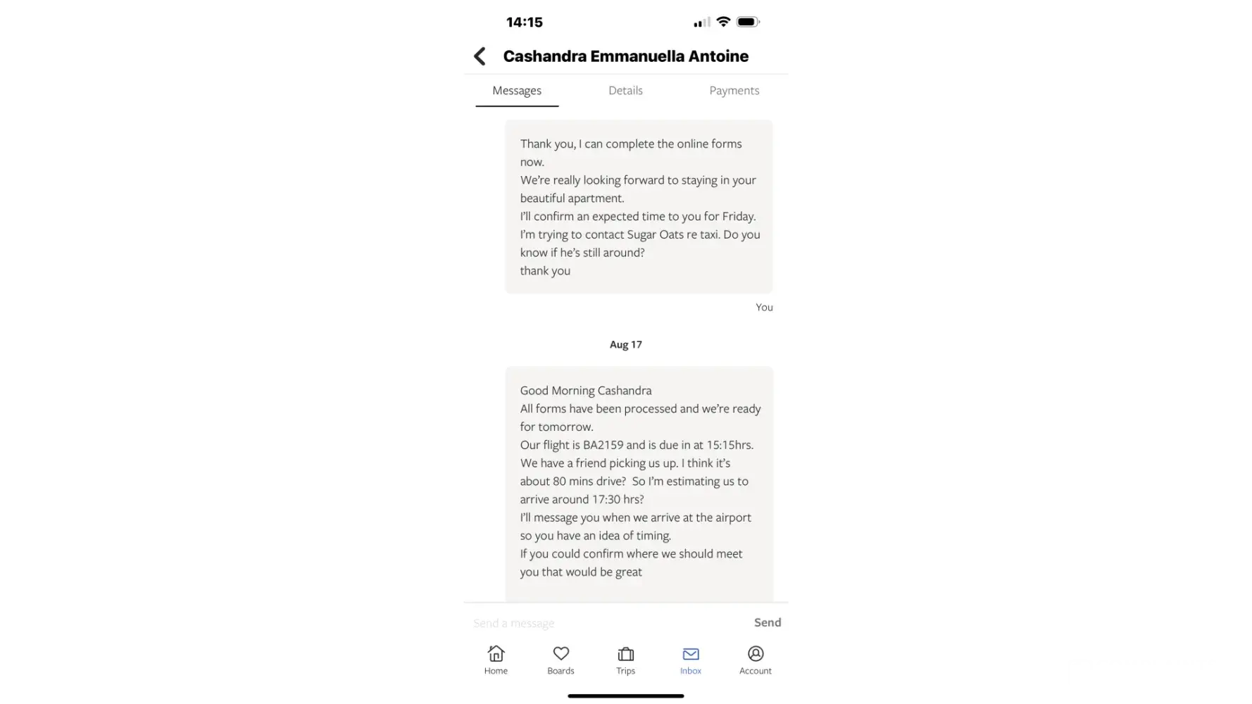 Since Barry B eventually told me to take an Uber from the airport, that is precisely what I did. And I arrived to an apartment that was shut, no one there, and I waited outside for almost 25 minutes. It was getting dark and I was in a foreign country. I've traveled extensively (using VRBO with excellent results) and have never been in such a situation. In addition, Barry B apparently gave my number to some driver who was supposed to pick me up at the airport. I was standing outside of the rental already arrived when I got a text from the driver saying that he was at the airport with a sign with my name on it. I told him Barry B told me to uber myself. He then threatened me by saying that I owe him the money for the cab ride because he went to the airport. He stated that he knew where I was staying and that he was coming to collect HIS money.