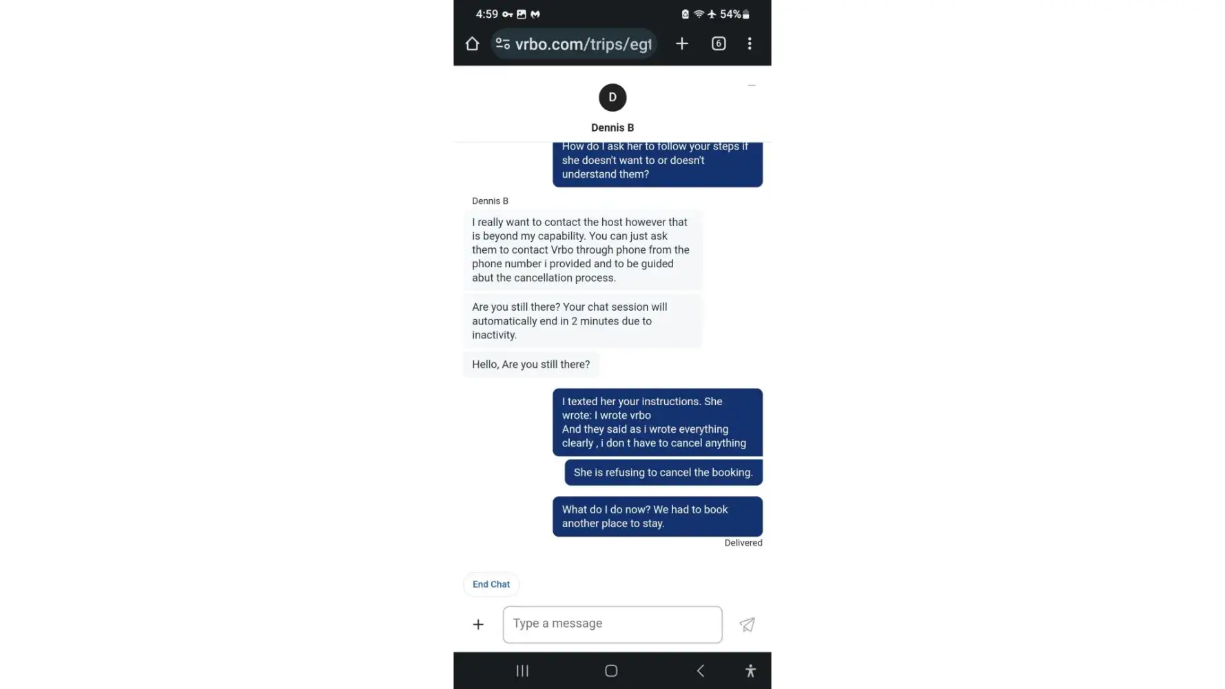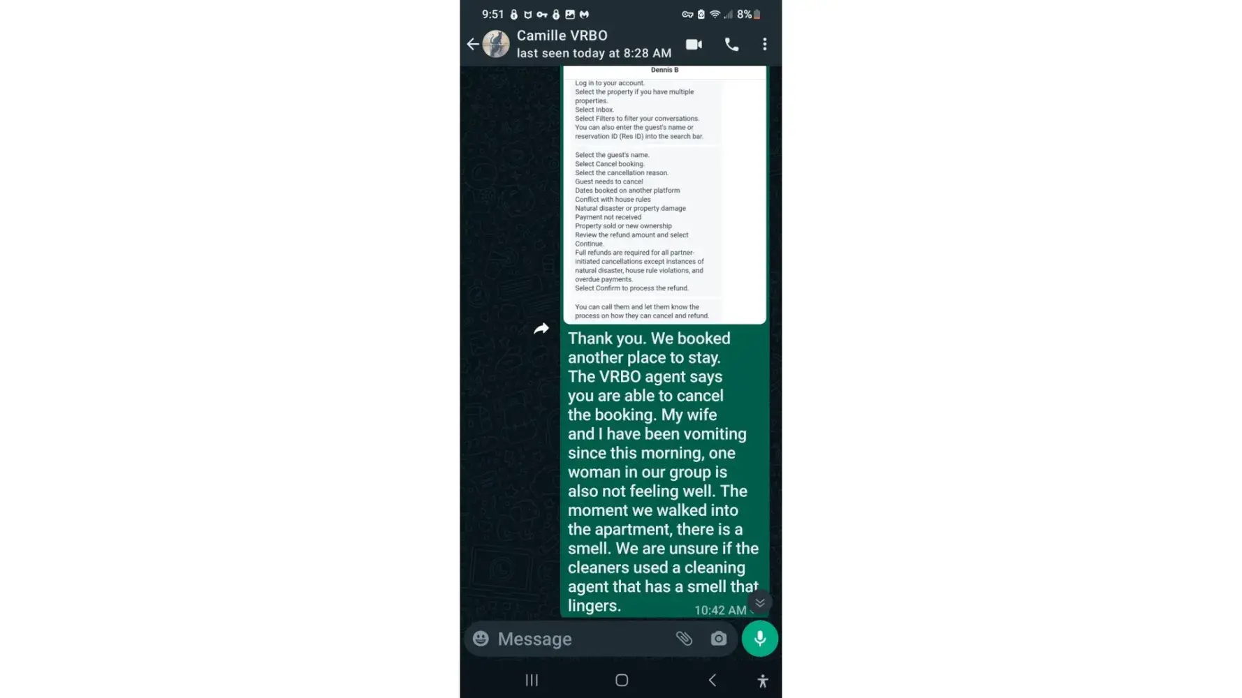 I immediately contacted the host at 4 pm and shared our concerns. She declined to take any action to cancel or refund the reservation. I contacted VRBO Chat and Dennis B over the next 40 minutes explained steps that the host could take to cancel the reservation. I sent the host all the information. She wrote that she contacted VRBO and according to her VRBO stated that she did not have to cancel the reservation. I phoned the host and asked if she could charge us for the first night and rent the apartment out for the other nights, but she declined.