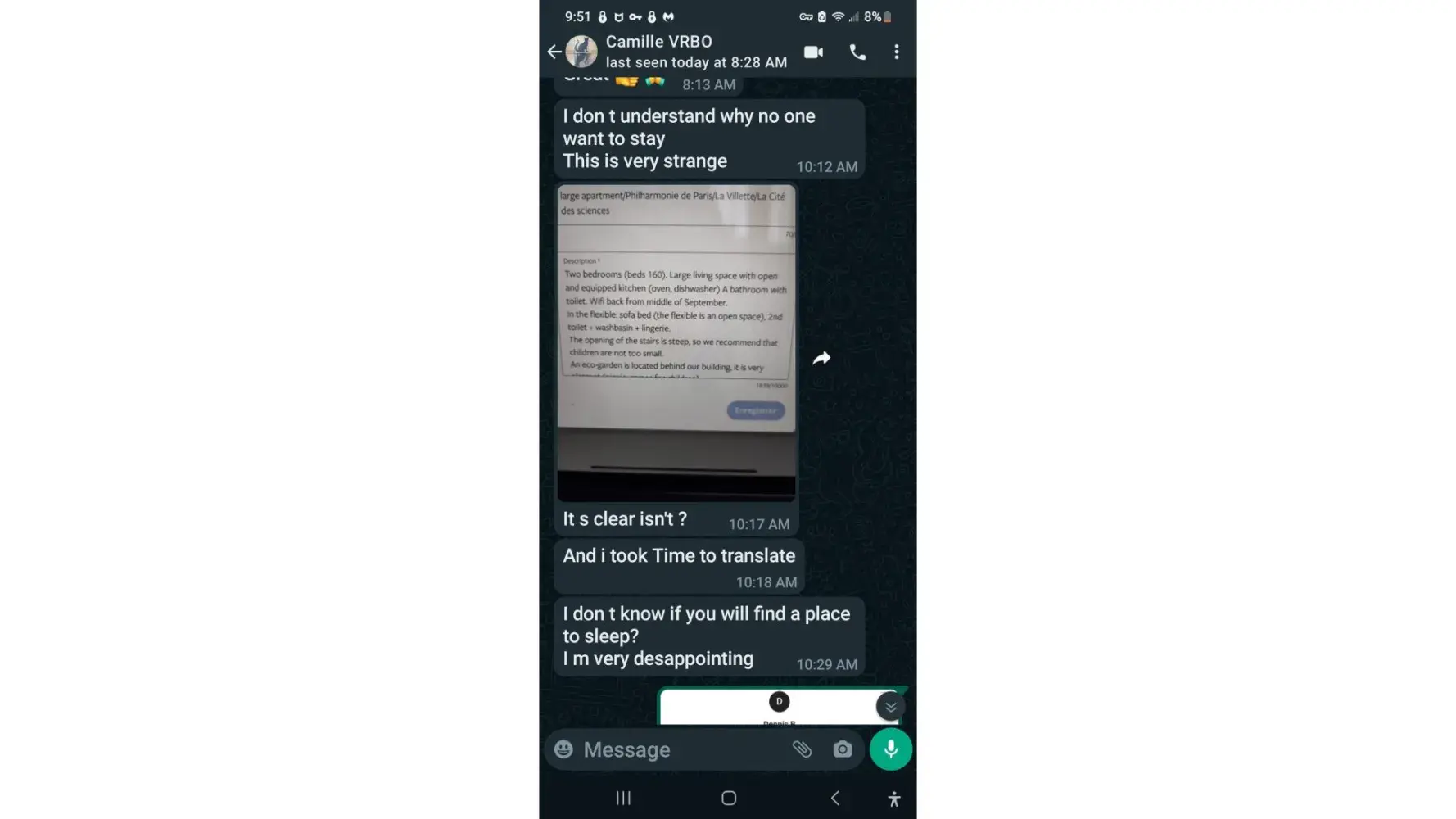 I called VRBO, because in addition to all of this drama, a young man came over to me on the street and began talking with me. He said his name was "Frank" and that he had the key to the unit. He let me in and then demanded $200 USD as a deposit for the key and the unit. I told him that this was NOT the procedure I've ever used in the past. He would not give me a key unless I paid in cash. I did and made him sign a piece of paper acknowledging receipt of my $200.00 USD. In addition, he took pictures of my credit card. So now with VRBO, I related all of this ridiculous information to the representative that was still on the phone. I told her that I did not feel comfortable staying in this apartment (in addition, it was musty and disgusting looking) since I was being extorted for money. She totally concurred and sympathized with me. She told me that she would find a hotel for me for the night. I waited patiently for over 20 minutes and then got disconnected. I took matters into my own hands, left that nasty rental and booked a different hotel by myself. I did not want any of this to ruin my trip (which it was doing already) so I told myself I would resolve this with VRBO when I returned to the United States.