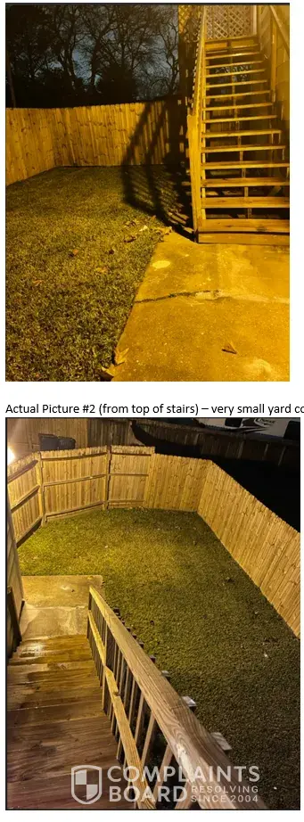 4. In addition to the problems described above, our major complaint is that the property was not as described on the VRBO website. We were traveling with our two mid-size dogs. One of the main reasons we chose this rental unit was because it was advertised as having a large yard which would allow us to safely walk our dogs in the yard, without venturing into an unknown neighborhood. The VRBO website shows pictures of the large yard. The pictures of the property show the entire yard available and that is how the property was advertised. We have pictures from the website that we can provide, however, your instructions said your system cannot accept photographs. However, upon arriving there was not a yard, just a small fenced-in area around the landing at the bottom of the stairs leading to the unit. We have pictures of the actual yard that we can provide, however, your instructions said your system cannot accept photographs. The advertisement of this unit with a large yard was a misleading and fraudulent representation of the unit.