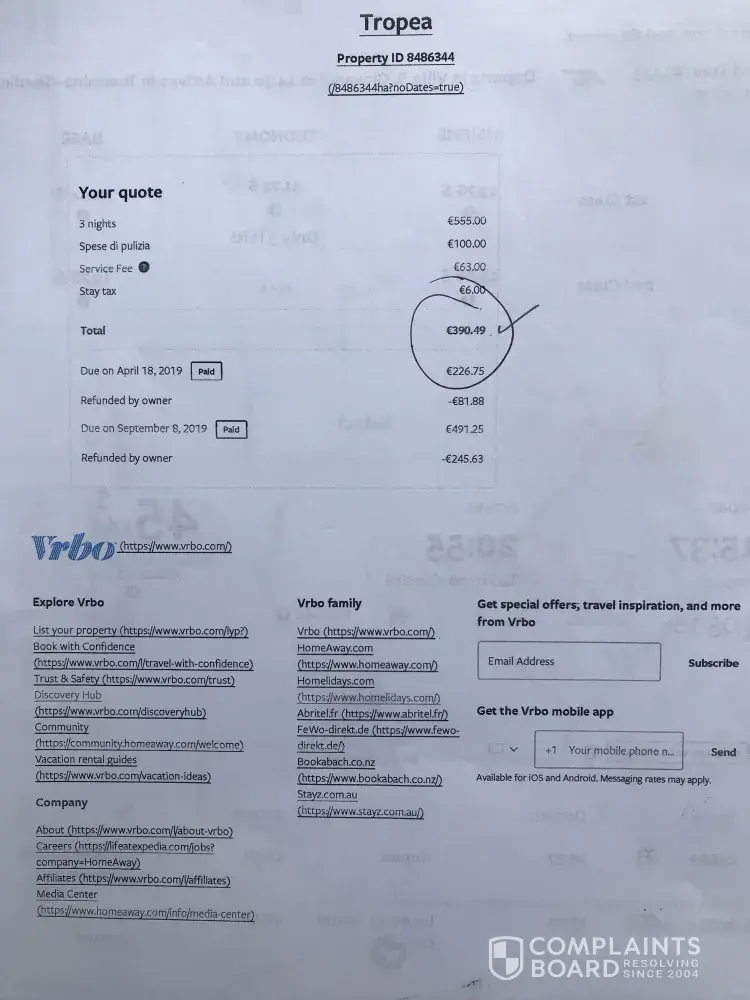 Issue: Received reminder from owner on 9/1 that second payment was due, despite 9/8 being listed as second payment date. On 9/3 I paid the remaining E491.25 by credit card to HomeAway. Almost immediately after receiving the payment, I received an email from the owner stating that he was cancelling our reservation, also dated 9/3. A VRBO invoice states that the owner then refunded me E81.88 and E245.63, for a total refund of E327.51 I believe that Giuseppi /Home Away still owes me E390.49