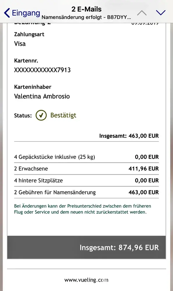 I made a booking for my parents for 14th of September to 19th to September through Vueling because normally I really like your company and the staff is very nice! Unfortunately my mother told me only after 24h that her name in the Italian passport is her birth last name (Aversa) and not the name from my father (Ambrosio) . Yesterday I did the name change and had to pay more than the double amount than I paid my tickets ( please find attached). I had a misunderstanding with the girl on the line because I did not understand that I had to pay all this money ( 463 Euros additional!) but at the end I did not want to make problems to her and said it‘s ok. I think it is really frustrating because it was only the my mother‘s last name and in addition AMBROSIO is on her ID as you can see, but only on the 7th line. Everyone can see on the ID that she belongs to Emilio Ambrosio and that they are married.