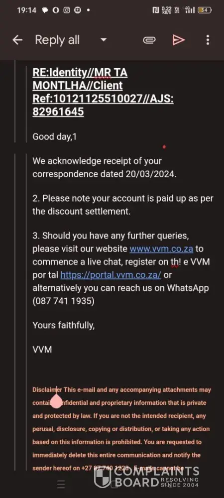 Thabo Alex Montlha, ID 🪪 [protected], hereby confirm that I contacted VVM for an Identity account Ref number: [protected], settlement amount, on the 15 February 2024