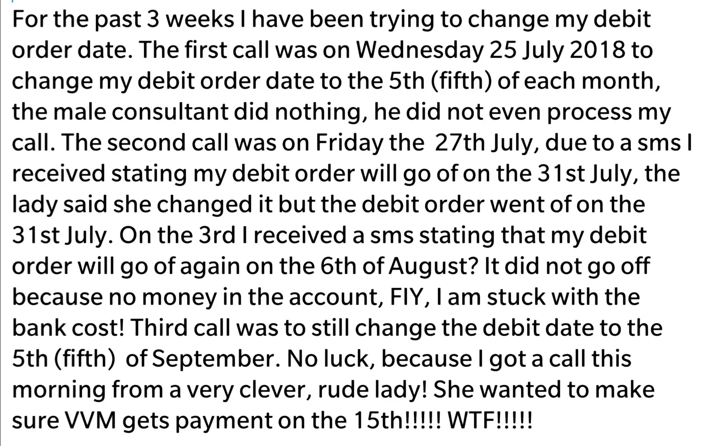 3 weeks I have been trying to change my debit order date. 1st Call: Wednesday 25 July 2018: change my debit order date to the 5th(fifth) of each month, the male consultant did nothing. 2nd Call: Friday  27th July, sms I received stating my debit order will go of on the 31st July, the lady said she changed it but the debit order went of on the 31st July. 3rd August: Sms stating that my debit order will go of again on the 6th of August? 3rd Call: No luck, got a call this morning from a very clever, rude lady! She wanted to make sure VVM gets payment on the 15th! WTF!Â