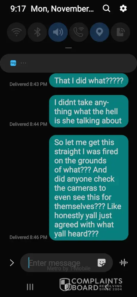 So on November 17th I was accused of stealing food or taking food or something like that and one of my co-workers had called the management and said that that's what I was doing and district manager called said that I was to leave and I was been taking off schedule I wait a couple of days no calls or text, nothing I texted the manager to see if I was put back on schedule or what was going on and he said apparently I was fired on the grounds of hearsay no one check the cameras nobody talk to me no messages no calls or emails stating anything not even what went on. And no paperwork like I just want to do my job. I didn't take nothing home I didn't give anything free or anything why didn't they look at the cameras I mean why are they not doing their job there are cameras for a reason I've already called the hotline and everything, I have a case number it's about to be Thanksgiving and Christmas why would I take when I'm about to make so much more cause of the holidays come on all I want is my job I feel like why is no one checking on this to even see if it's TRUE or not. I was treated so unfairly.