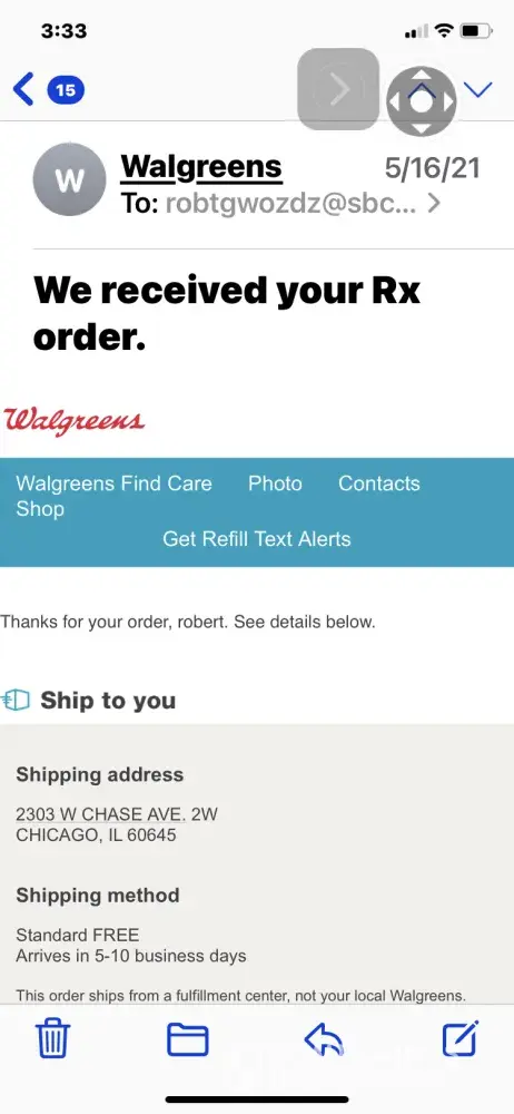 On May 16, 2021 I received a receipt that Walgreens. Com received my prescriptions. There were 3 and I had to reorder and pick-up 2 from Walgreens.