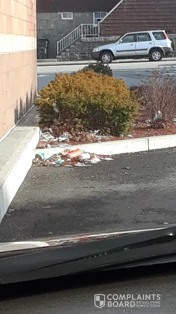 for past 3 months this area is corner piled with trash coffee cups even inside bushes it totally embarrassed for so many months.even last summer did that again.reporting 2/12/2020 please send an inspector to observe their filth & laziness.it needs to it clean every day.