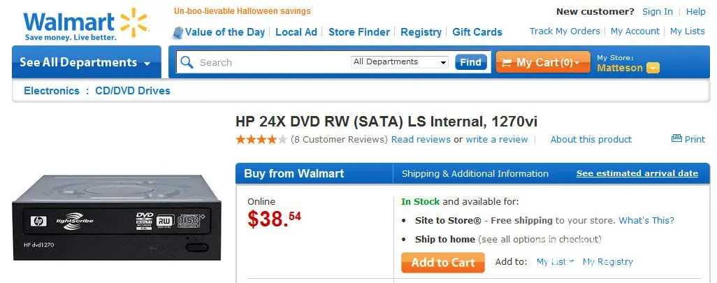 Classic bait and switch pricing. Online, Walmart offers (in this particular instance) a replacement Optical Drive Model#: 1270VI for home computers at $38.54 they also offer you the ability to check a local store to see if they have them in stock. Needing an optical burner drive to complete a project I checked to see if my local Walmart store had one in stock. Yes they did. Needing this drive I drove down to the Walmart store in Matteson, IL. Where to my shock I found the exact same drive offered online. Only this exact same unit was shelf priced at $49.95. Needing the device and having spent the time and money to drive to the store I was compelled to purchase it there. A huge 25% price increase over the online price. The item is offered on the web with no mention of additional costs, just the friendly link to show that it is available at 4 local stores... Offering an item at a price is advertising, when you get to the location and they will not honor the advertising is FALSE ADVERTISING. This practice doesn't really fall into the bait and switch catagory because they have the nerve to offer the EXACT SAME item. They will not honor their own deceptive advertising. They WILL offer to order you one of the units. (Exactly the same as the one on the shelf...) But it will take 7 to 10 days to be shipped in to the store. If I had wanted to order one online and get it in 2 days I would have picked a proper internet retailer. Other retailers that follow this same bait and switch pricing are: Best Buy. Retailers that honor web advertising are: Tiger Direct, CompUSA