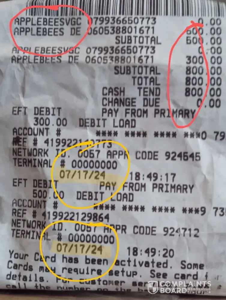 I'm not sure if Walmart is the one at fault here with the main issue but they are at fault for taking no action on the issue at hand. I have 2 gift cards, one for $500 and the other for $300. I contacted Applebee's customer service and asked them if they could put a hold on the cards so they couldn't be used. An untrustworthy character had card and pin numbers for both. I was told they had nothing to do with cards purchased through 3rd party retailers. I was told Walmart was responsible. Walmart's customer service informed me Applebee's was the responsible party. After going back and forth using different numbers I found, I got absolutely nowhere. Now, the $500 card shows a balance of zero. I called both parties and asked again, informing each that the $500 card was depleted. Still, neither party would budge on doing anything. I am a customer to both of them. Even though each party felt they weren't responsible, since I am a customer to both, you would think at least one of the two would have put in some effort to contact the other. Especially after hearing about the $500 loss. I was actually phone blocked on 2 different occasions by Walmart for calling too much. I was polite with each call too. This must happen a lot. Walmart actually transfers you over to Applebee's.? It's time to get this straightened out between these two companies. I'm making an identical complaint about Applebee's as well. Thank you in advance Complaints Board. I'm not sure what I would have done if I didn't run into your site. I had run out of options looking for different ways to make contact with each company. Please, if you will, give each my contact information when you inform them of the issues.