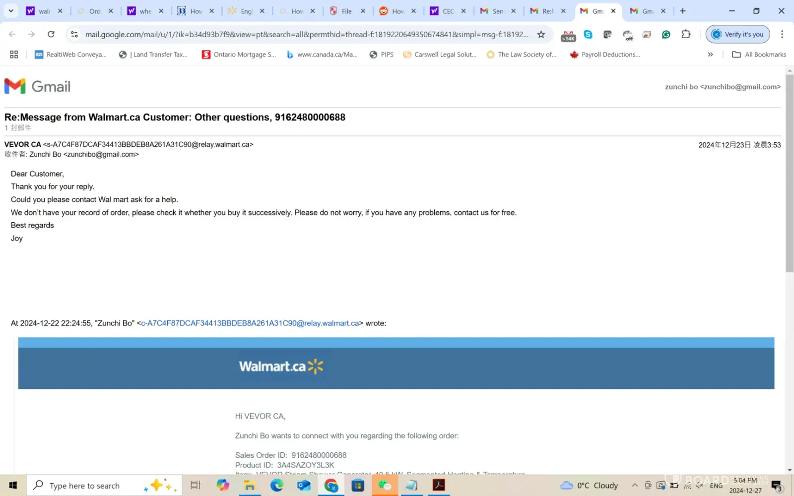 I ordered a vevor product through walmart.ca and it was canceled twice due to some glitch. I contacted the third party seller vevor and found out the glitch is on Walmart side. And the gift card I received by email as a refund of the canceled order has 0 balance despite the order detail that Walmart will not charge me anything. It took me time to chat online with walmart agent but the problem not solved. Then I called customer service and gift card department multiple times but every time I was asked to wait until technical team to call me back. Walmart staff promised to call me back within 2-3 business days. I reported the problem on Monday Dec 23,2024 and I called back on Dec 26, 2024 which is on the third business day (23rd, 24th and 26th). I was told I still need to wait and today is Dec 27,2024 and I still did not hear back from Walmart.
