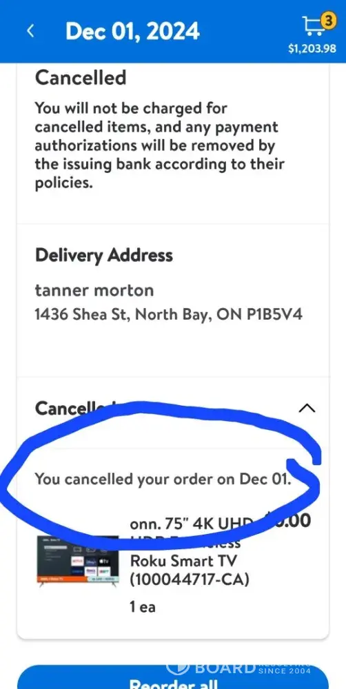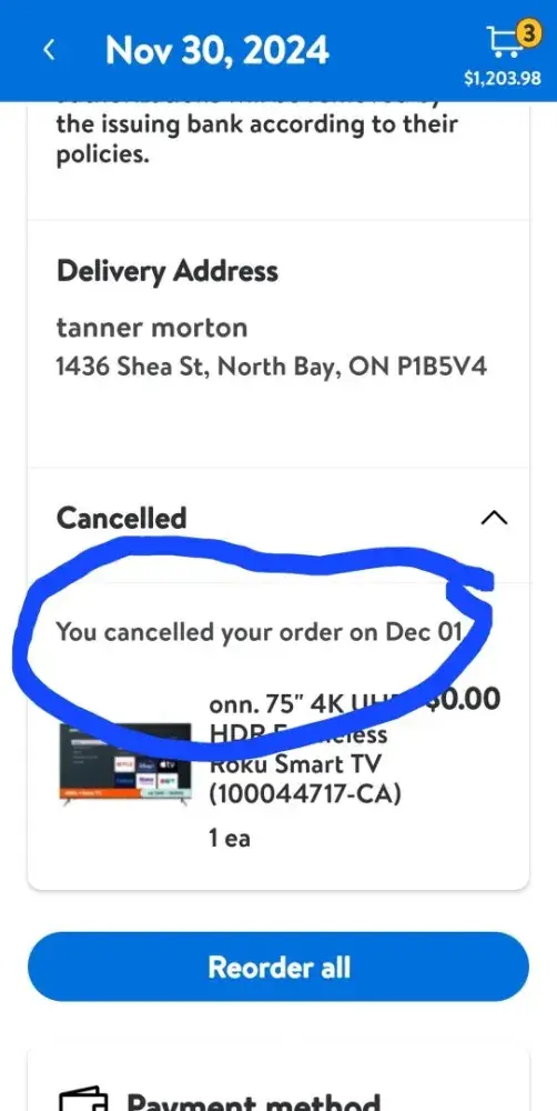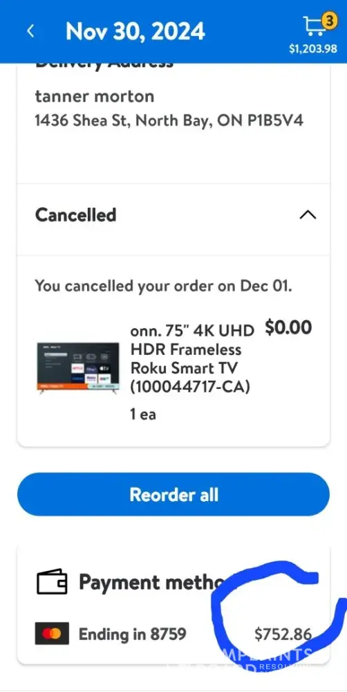 1. **Order Issues:** On November 30th, I purchased a TV for $752, which was canceled due to a "technical error." Unaware of being charged, I repurchased the same TV the following day, December 1st, and this second order was also canceled, resulting in the same charge of $752.