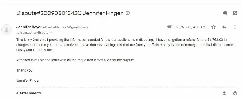 8/28 I went to pay my bills, I immediately contacted the number on the card to dispute the transactions on my card that I did not make or authorize. I emailed and sent in the mail, all the information that was requested of me. I read in the FAQ section when looking what to do when I found the unauthorized charges, it states that it can take up to 45 days to investigate. If so, they will credit my card with the amount I think is in error within 10 business days. So I'll have money during the time. If they don't get complaint in writing I won't get provisional credit. I did not get my $1, 762.05 credited back to my account at any time! I have not gotten a letter in the mail with any kind of update or anything. I get nothing but the run around when I call or I get placed on hold for a long time then hung up on.