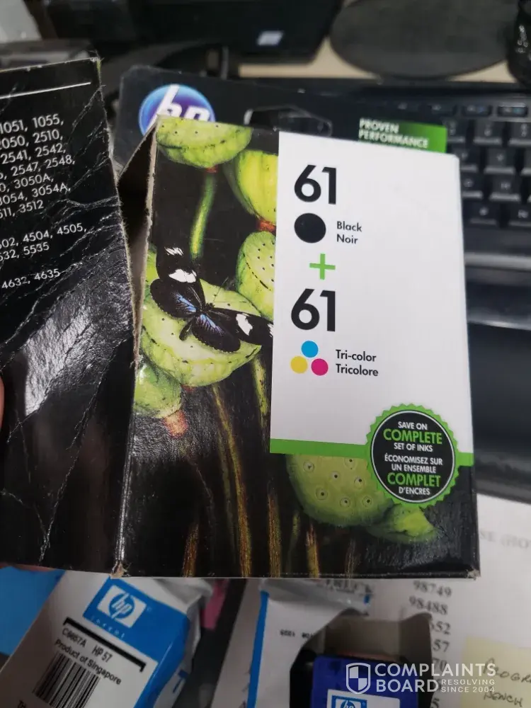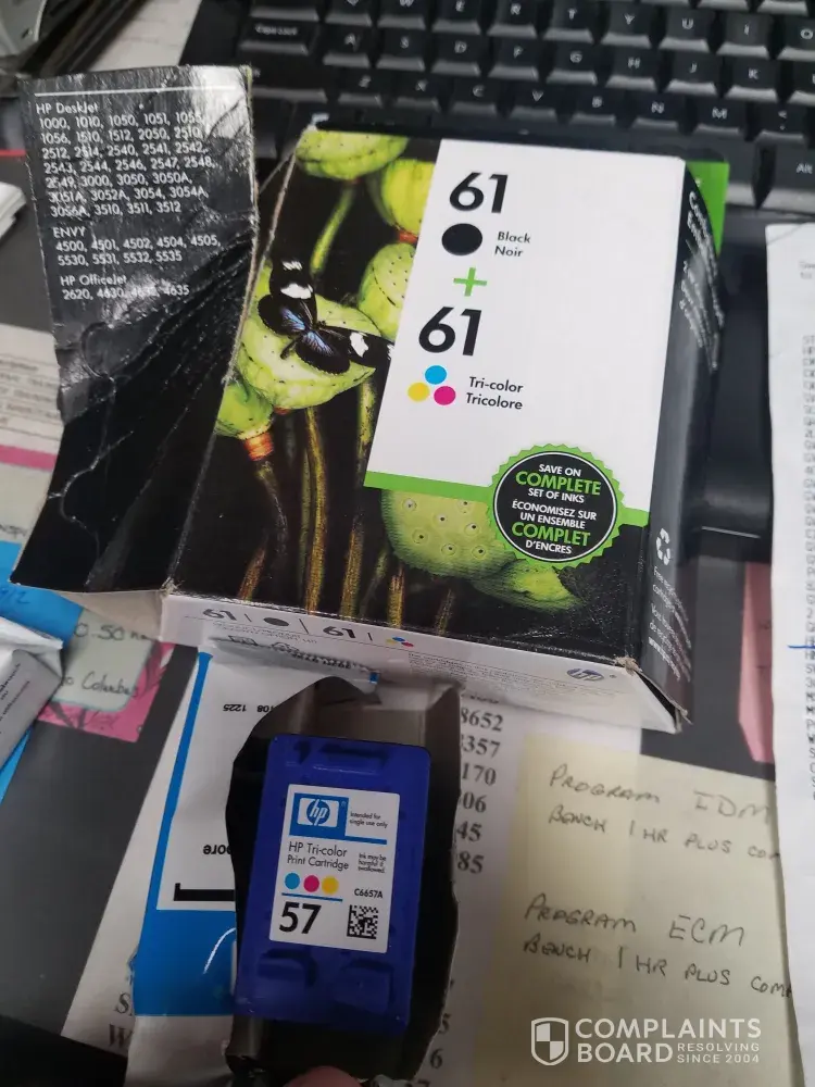My wife purchased a HP printer cartridge HP61 on the box on 4/7/2019. When she got home, I opened the package (the box) and opened one of the aluminum wrappers and noticed the cartridge was hp57. It appeared to be packaged wrong. My wife went back to the store to swap it out and they would not. It was a two pack (color and b/w). The other cartridge wa...