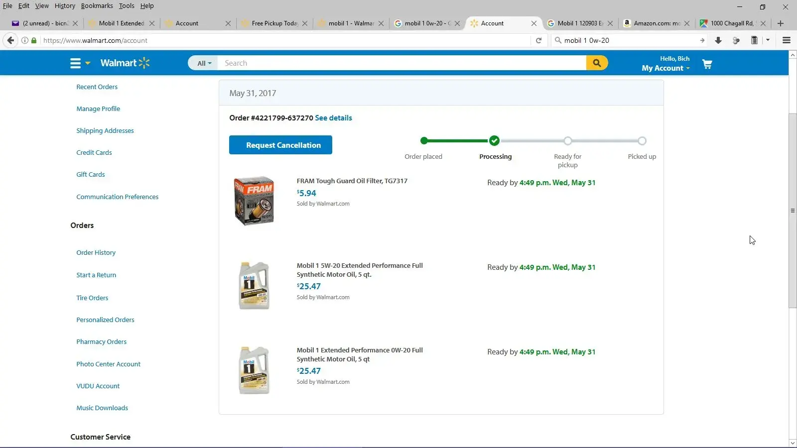 I placed an online order for two jugs of mobil 1 synthetic oil walmart stock number #[protected] and #[protected] to be picked up at a local walmart. The items are listed as "in stock" and the order confirmation online claimed that items will be ready for pick up May-31-2017 after 5PM and to wait for the email notice for pick up. The email notice never came. The next day, June-1-2017, I called the local walmart to find out when I can pick up these "in stock" items; rep told me to call walmart.com. Apparently the online business and brick and mortar do not talk to each other. I called walmart.com and ask rep when I can pick up the items. She called the local store to find out; I told her that I have already done that but she insisted and put me on hold for 20+ minutes only to come back and told me that she was put on hold as well. I could not believe how customer service could be this lame. I asked her to check nearby stores to see if they have the items so I could go there and pick them up. She gave me an address on another walmart stock and told me that the items are in stock and on the shelf in that store. I drove all the way there and guess what; the items are not there. I distinctly felt that I had been sold a bill of goods and they want to get me into their store on the off chance that I will buy something instead. This is clearly a bait and switch tactic. I talked to the store rep and ask her if she can find out if nearby stores carries the items so I can pick them up today. She appeared to be on the phone and stood there for 20+ minutes. At this point, I gave up and told her that this is no way to treat and retain a customer and I will make a formal complaint; she dared me to do it. This new walmart is but a faint shadow of the old walmart and I will not be surprised to see walmart fades away as they cannot compete against online shopping. Guess what, I went to Amazon and ordered the same items at the same price with free shipping. I just want others to avoid the hassle I've been through and urge you all to avoid Walmart like the plague.