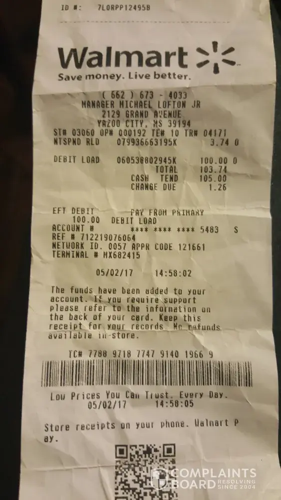 I called NetSpend on 5/5/2017 and reported that I tried to pay a bill from the card ending in 5483 on 5/5/2017 and it declined. I put a debit load of $100.00 on the card at Walmart and they charged me $103.74, which was tax on the loading. I had a remaining balance of $16.00 and some change on this card ending in 5483. I tried to call the company number they gave me, but there was no answer. Customer Service said that the transaction was done at 12:00 midnight. I told them I was at home in my bed at that time of night. I need to pay this bill right now; if I don't, my service is going to be interrupted. I do not have anymore money, I have sent a copy if this receipt . Thank you!
