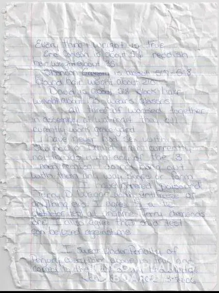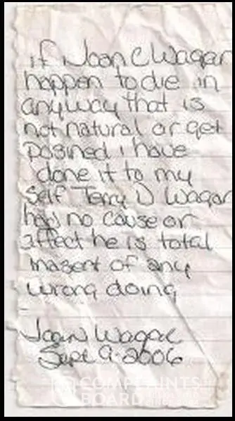2006 By the time of Joan Wagar writing this written confession that she uses antifreeze as poison I was so debilitated at this time I was bedridden, Joan Wagar tossed this at me like it was a Frisbee because she wanted to see if I could get out of bed to try and find help or not, I could not!