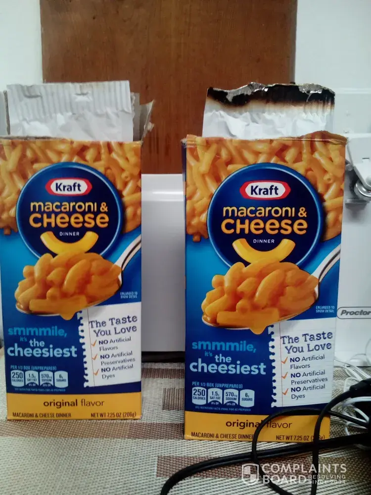 One of the boxes we purchased from Wal-Mart in Lecanto, Florida, had a burnt end in the cheese package I pulled out! We did not eat it, luckily we had a back up box!