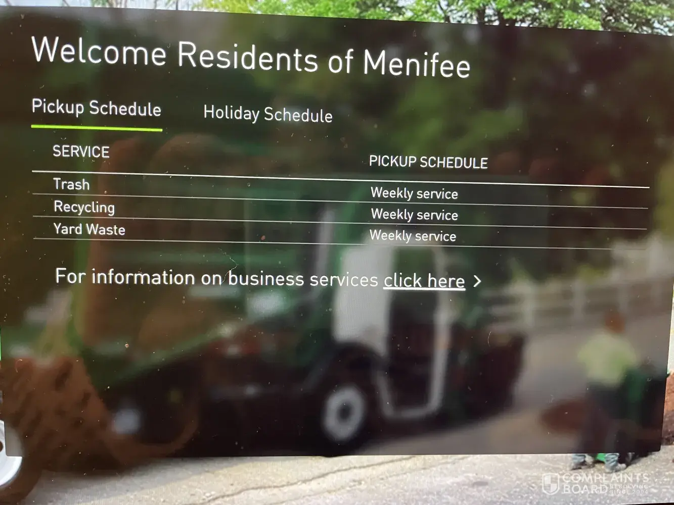 Our recycling is only scheduled every 2 weeks, yet when I input my address into wm database the schedule that pops up clearly states that my trash/recycling and yard waste will be picked up every week. For the past 9 months this has not been the case. We pay $89 every 3 months, as well as $7, 000 a year in taxes, but services are not rendered as stated.