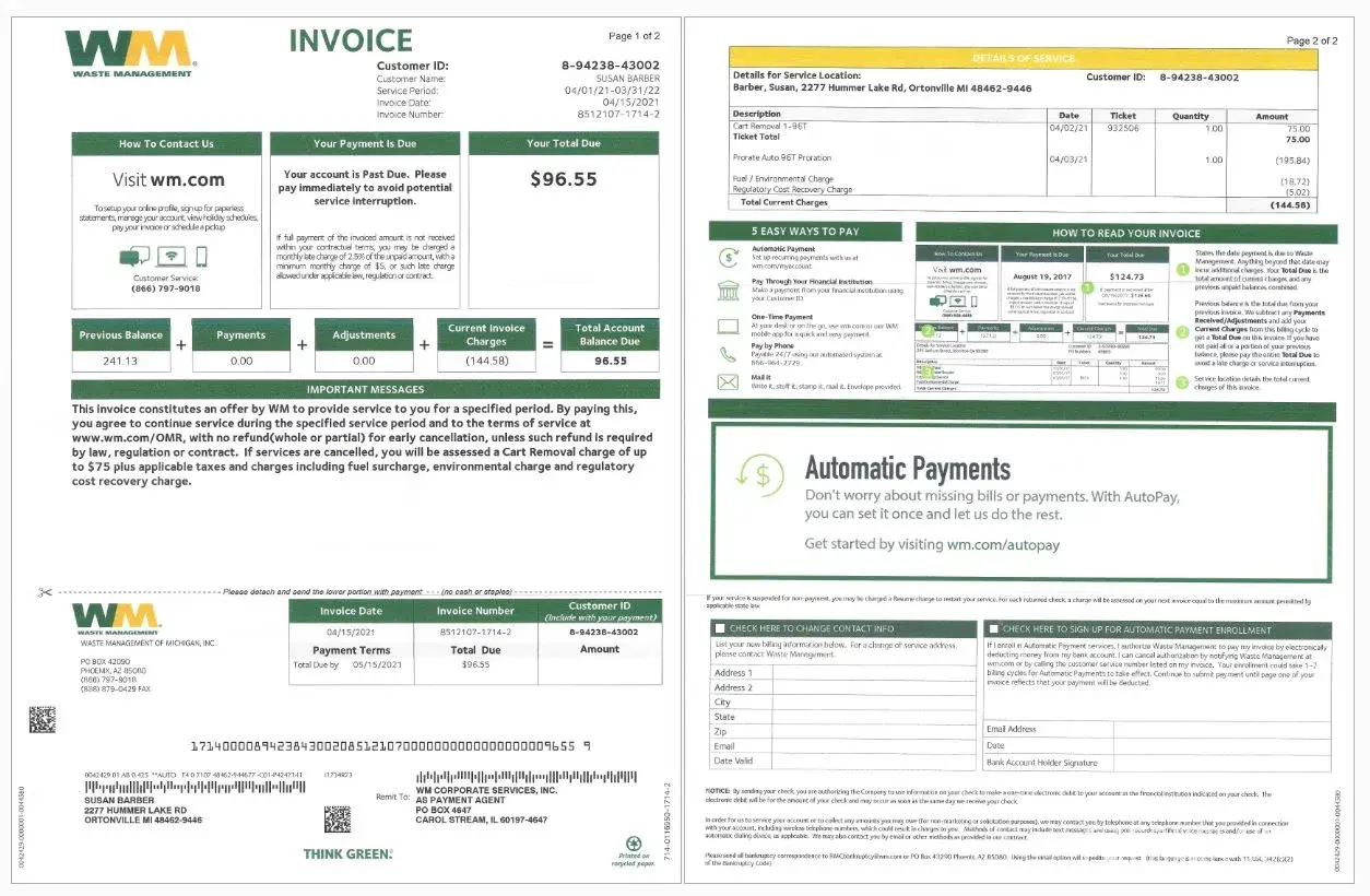 On April 21, 2021, I received the attached invoice in the amount of $96.55. It indicates that I have a previous balance of $241.13 and that I have been credited $144.58 in pro-rated charges. It also shows the $75.00 Cart Removal fee.