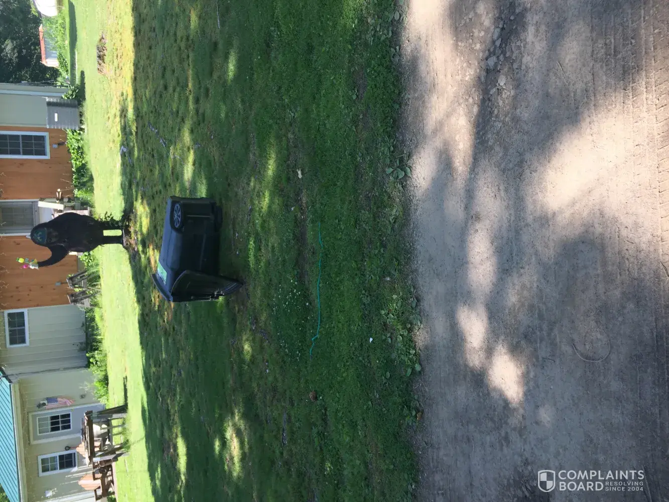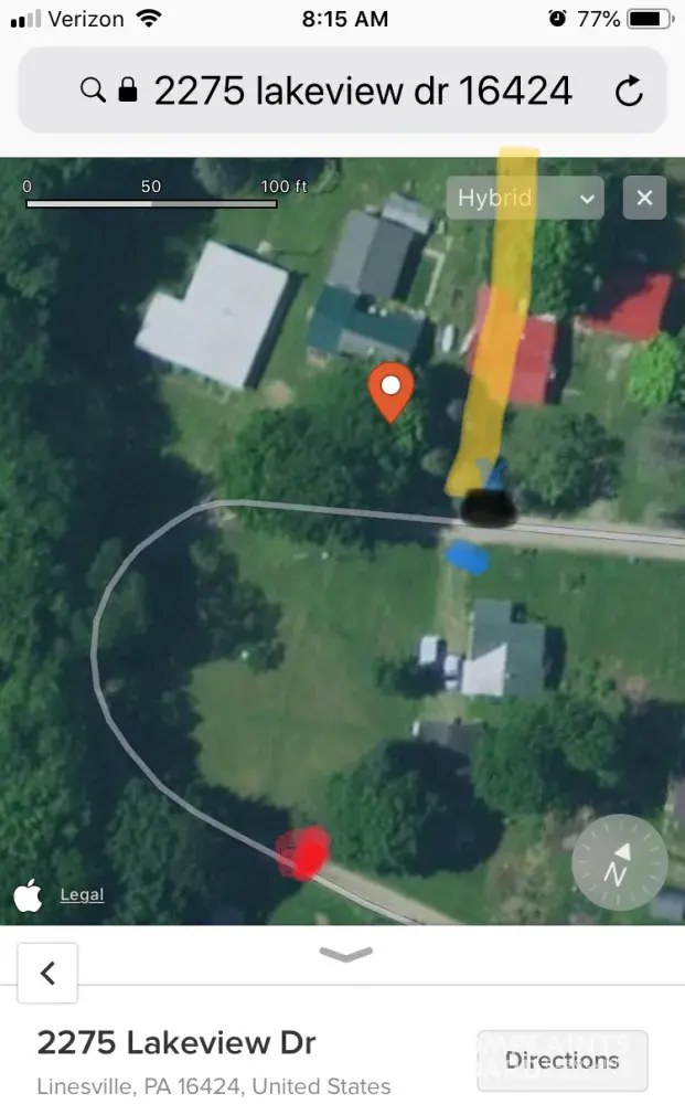 My neighbor house with red roof sets on the property line (yellow line) I put my can (black dot) across the gravel lane from my neighbor (blue dot)
