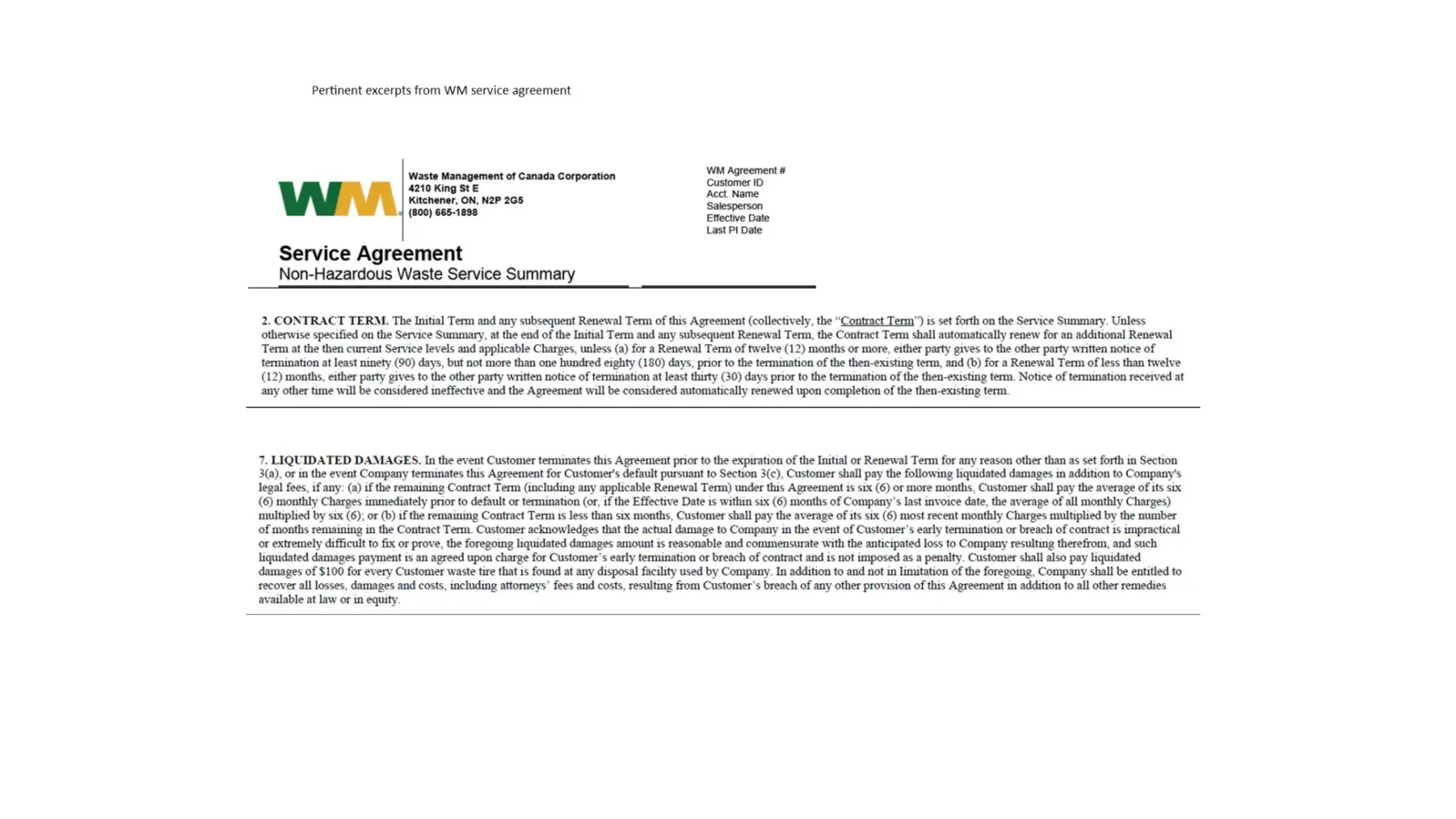 After several unsatisfactory communications with two different account associates, one of whom told me there was no one above him to whom I could speak, I located the email address of WM's CEO and emailed him with my concern. I was quickly referred to an area manager who waived the 90 days' notice, which would have cost us $4, 500 in unwanted service, and terminated our contract effective Jan 1, 2022. It pays to question and push back when dealing with huge corporations, exhausting as it can be to do so. The area manager agreed that the contract language was not as clear as it could be while stopping short of saying it wasn't still binding. We are still out over $8, 000 in liquidation damages, but it could have been worse.