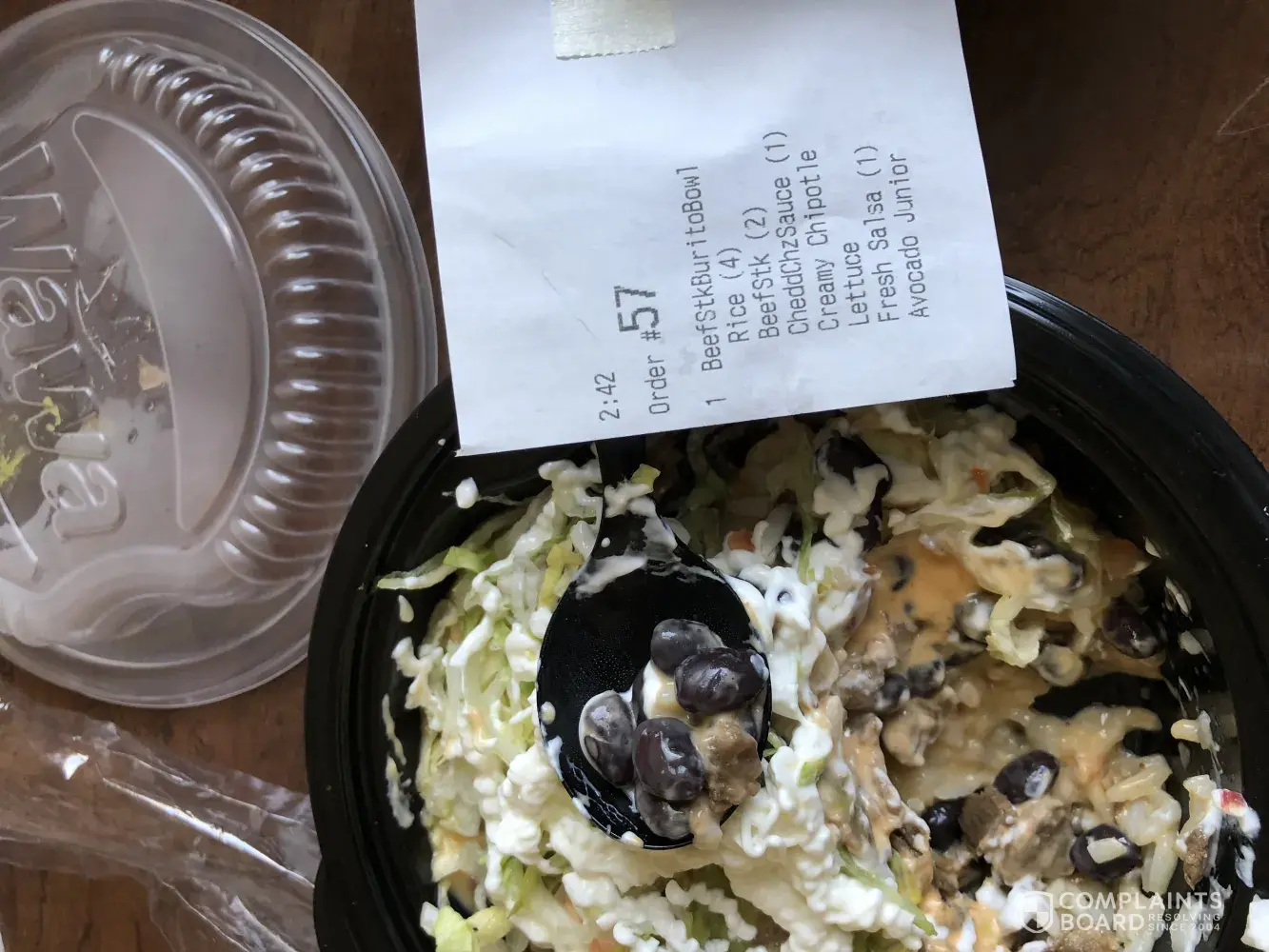 I ordered a burrito bowl with no beans. I get home and there is beans in my bowl. I was very upset. On the order ticket it even said no beans. Only rice, beef, cheese, chiptole, salsa, lettuce, and avocado. I only received a small dab amount of avocado as well. I seemed to find portion extremely small. The rice also seemed to be cold and the lettuce looked brown like it wasn't fresh.