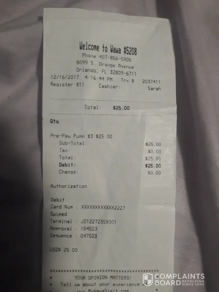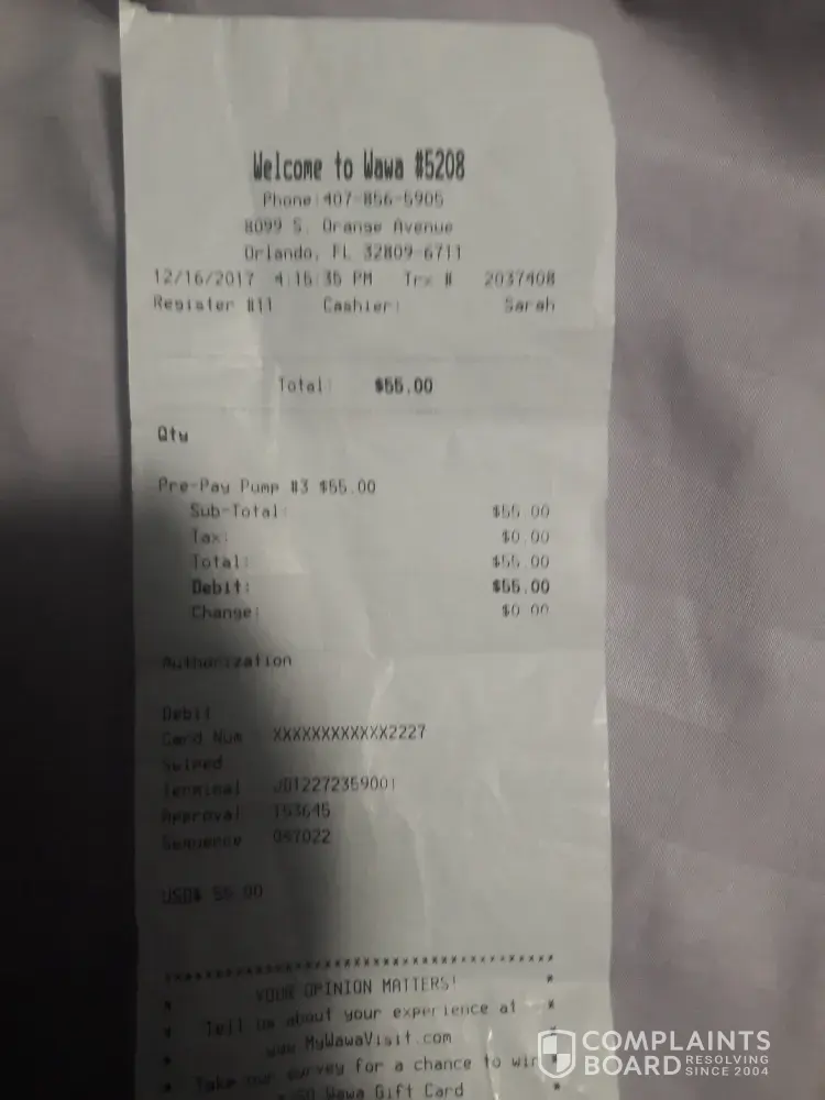Hello my name is Sarah Garay, On 12/16/17 I purchased Gas at store (8099 S. Orange avenue orlando, fl [protected]) Store number #5208.