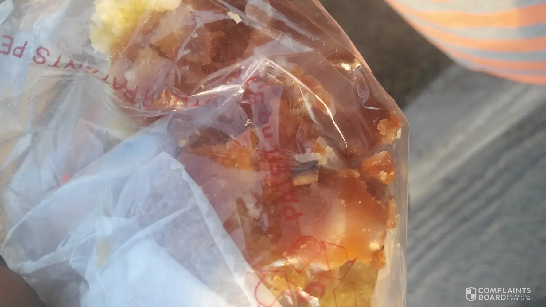I purchased a donut on November 8th 2011 I was eating it with my goddaughter luckily the piece with the rubber in it and my mouth here is a photo I'm going to attach of the piece of rubber that got stuck on my chipped tooth in the back of my mouth. I put it back in the bag to return it to the store. I was trying to keep it short and simple but they say my statement is too short and y'all might not look at it but this is serious what is a short paragraph or a long paragraph you should read it this piece of rubber got stuck in the back of my tooth that's chip I was feeding my goddaughter this donut likely put the piece with the rubber in my mouth and not her mouth when she would choke on it you know what you all have a blessed day and hopefully no one comes across anything else like this