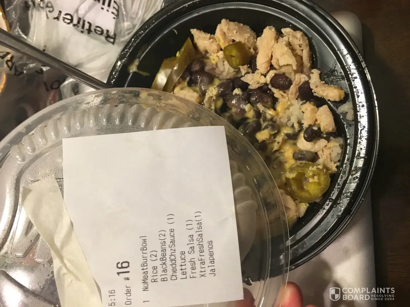 I am uploading a picture so you can see that your employees clearly can not read! I asked for no meat, and what did I get?!? Chicken. Last time I checked, chicken is meat. I asked for lettuce, fresh salsa and even paid for extra fresh salsa, and what did I get?!? No lettuce, no fresh salsa! How hard is it to read off a screen? I am so devastated, and honestly annoyed because now I am wasting food, because I have to throw it out and I live too far to go back. What a waste of my money and a waste of my time.