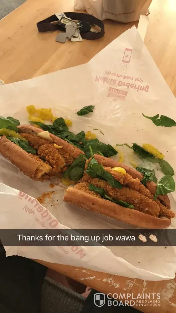 Today is my first day off from work in a while so I decided I was going to take it easy today. I didn't have any big plans or anything, so there wasn't a whole lot to look forward to. It was around 3 pm. that I though, "why not go to wawa and get myself a nice sandwich!" Good idea right? WRONG! SO [censor]ING WRONG. I was very much looking forward to eating this sandwich until I unwrapped it. I ordered a chicken tender classic hoagie with bacon, sun dried tomato pesto, spinach, hot peppers, salt pepper oregano and old bay seasoning. Oh it was such a glorious image in my head I could almost taste victory. I was getting hot and heavy for this sandwich and I'm almost positive that I was close to achieving nirvana as I approached the cashier to pay for this soon to be tasty treat. Things were going so well, almost too well one could say, but as soon as I wrapped my fingers around that sandwich I could tell that there was very little effort put into making it. It was almost as if storm clouds had raced in from the sea and swallowed up the blue skies and stole my sunshine because I could feel this sandwich already falling apart within the wrapper. A very optimistic one I am though, so I continued on my way, still with high hopes of indulging in such a glorious masterpiece of a sandwich that I had invisioned in my mind. The closer I got to my home the more I felt like Charlie when he found his golden ticked indie of that chocolate bar. Things were starting to look up again but little did I know they were only about to get worse. When I arrived at my house I brought the sandwich to my kitchen table, salivating at the thought of finally tasting such a work of art, I began unwrapping the sandwich while simultaneously preparing my tastebuds to blast off on a one way trip to flavortown. What I found contained beneath the paper sandwich wrap was nothing but utter disappointment. It was apparent that nobody would be going to flavortown today. The chicken looked delicious, sitting there atop of the applewood smoked bacon, both lathered in the sun dried tomato pesto, almost as if a ménage à trois had just taken place. This was the only appealing part of the sandwich, the rest was very hard to look at. It was as if only a few of the spinach leafs and hot peppers received the invitation to the flavorful orgy, while the rest laid there on the side, not even on the sandwich. It reminded me of people abandoning the titanic after that iceberg split it in two. It seemed as if the spinach and peppers were just carelessly thrown on top of an already prepared sandwich. Another thing that really grinded my gears was that I asked for white bread and was given a sandwich on whole wheat. I know there are only two bread options, that's literally a 50/50 chance of using the wrong bread. How do you [censor] that up? That [censor] ain't cool wawa. I used to think very highly of your service but not after today! I am very dissatisfied and feel entitled to some sort of compensation.