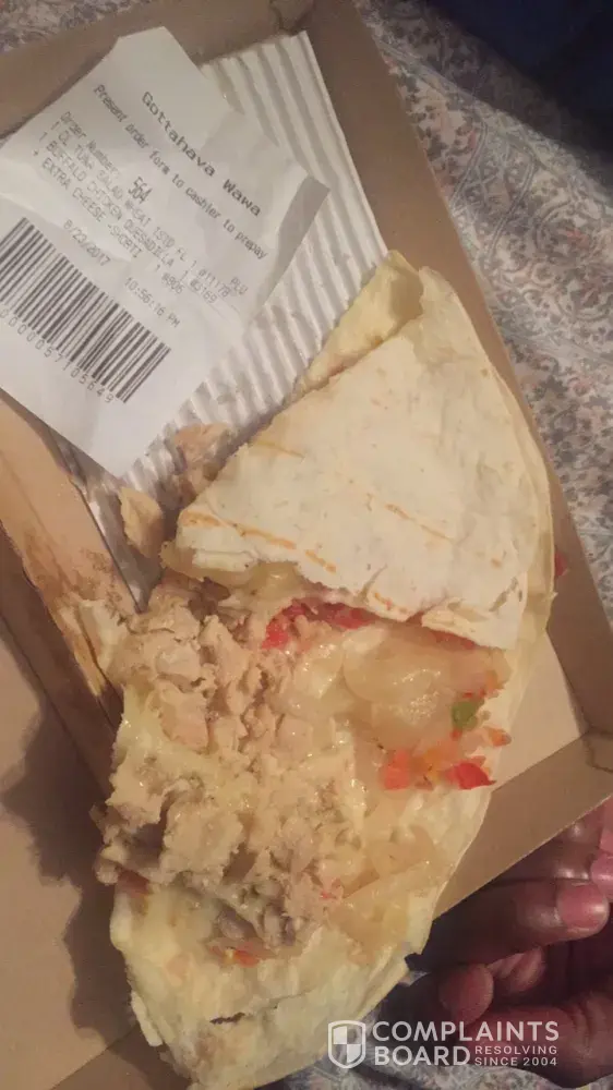 I went to wawa to get some good for my girlfriend and myself after working all day and her studying all day all I wanted was a buffalo chicken quesadilla so I Ordered a BUFFALO chicken quesadilla & when I got home to sit down and eat to my surprise they forgot the buffalo sauce... I already drove all the way home and wawa is a good 15 minutes from I tried to eat it but it's not that appetizing