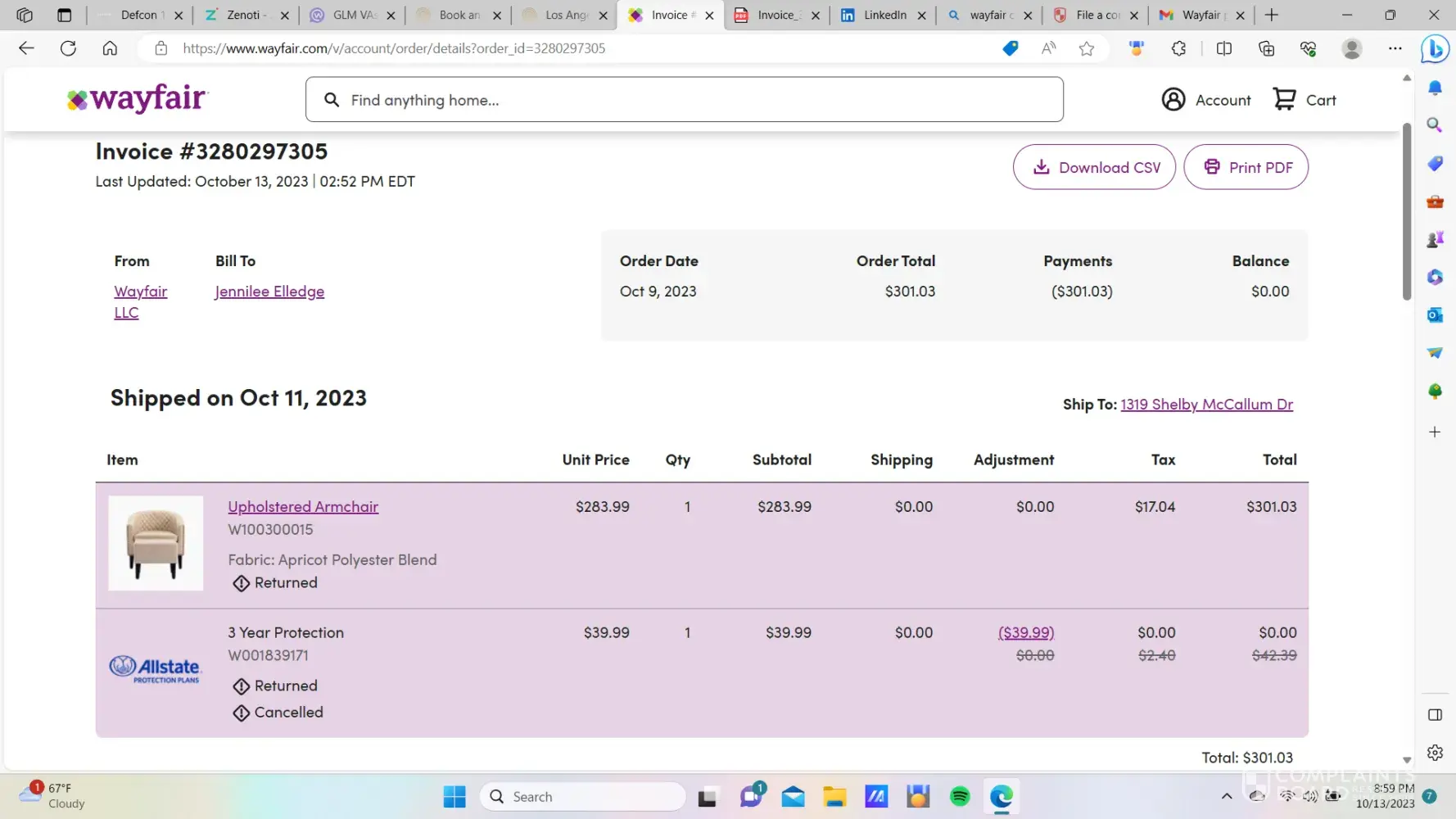 I call Wayfair (No, you don’t owe us anything). Called Citi, they tell me Wayfair refunded one of my items, something about an fraud investigation, no fraud found , it was discharged as bad debt.