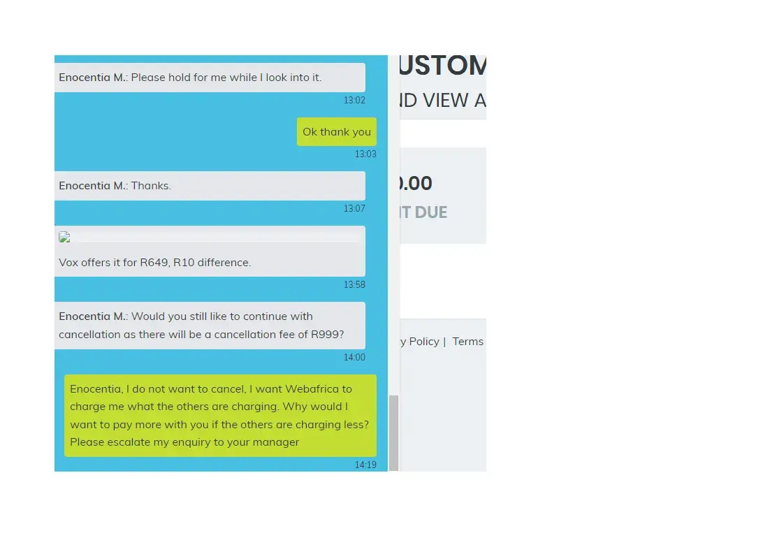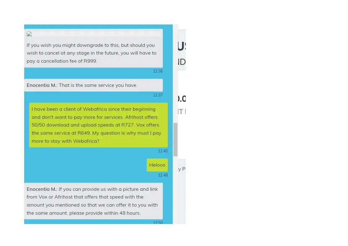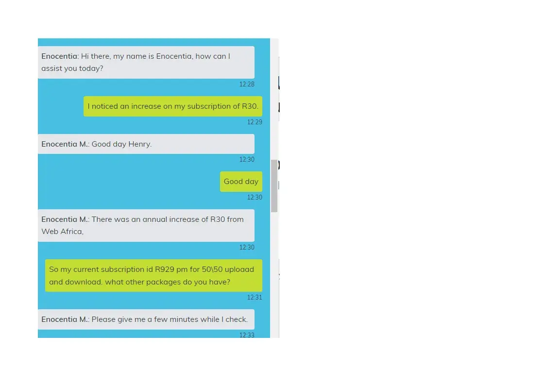 I contacted WebAfrica's WhatsApp support line (as its the only way to contact anyone there for support) to ask if they could at least charge me what their competitors are charging.