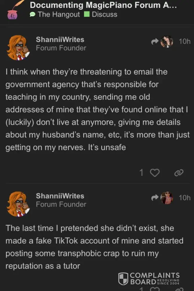 So this online forum has been verbally harassed and threatened with false imprisonment and lawsuits that they don’t even know how to stop snooping on Amagicpianoforum multiple times just trying to make her look bad and make her to delete her forum. Shanniiwrites is the one who to blame and she selfish behavior towards others has hurt people badly.