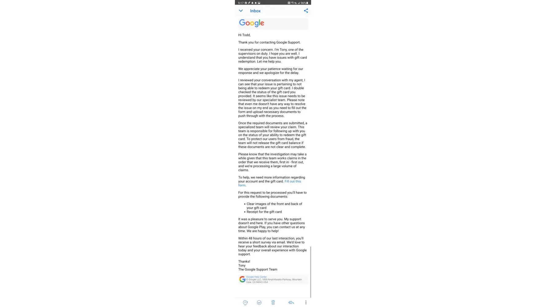 I purchased a $100 Google play gift card on this site. The card that was sold to me was flagged as fraudulent by Google. They are requiring me to submit further proof to redeem it. The proof they want is the original proof of purchase. I notified the seller of this and the seller refuses to or is unable or provide this information. I requested a refund the...