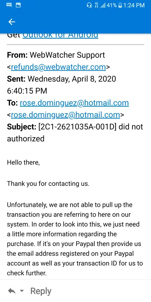 I am filing this compliant on behalf of my self someone added a webwatcher to my services that l did not authorize
