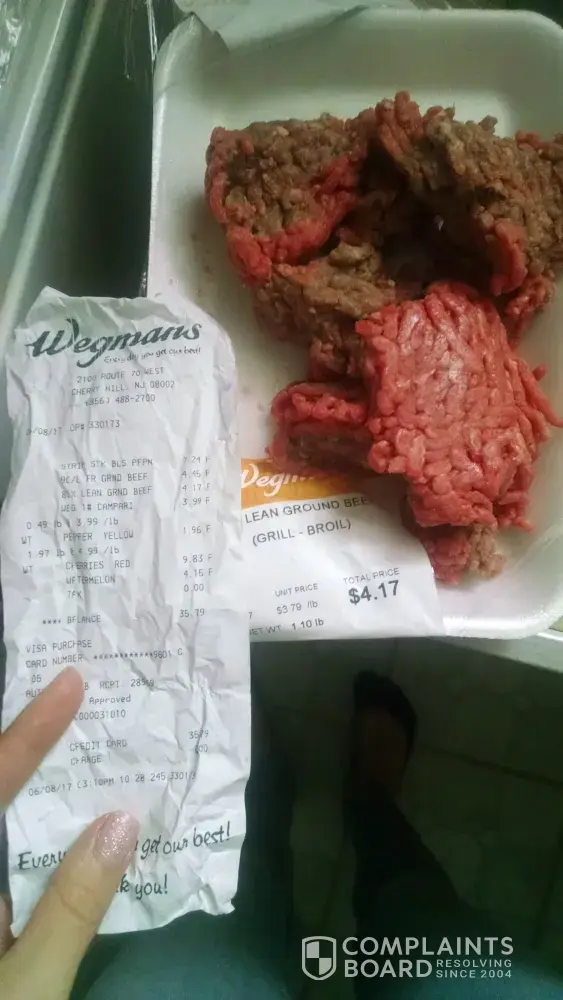 I went to Cherry Hill Wegmans to buy some ground beef. When got home and started mixing it with spices, it turned out to be dark brown inside. However, from the top it looked red as if it was just packed. I have a feeling that they covered old ground beef with a fresh one! It looked absolutely disgusting. Would you feed your kids with this?! I hope you can see a pic of this nasty ground beef!