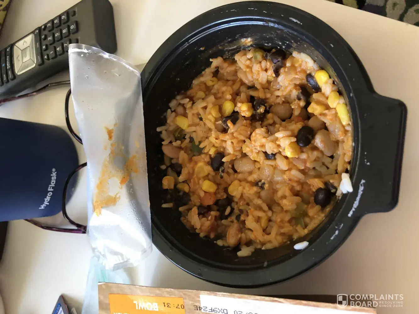 Mostly rice with a few beans and corn thrown in. If I ate this I'd be eating about a half cup of white rice void of any nutritional value the box (pictured) shows the opposite of what is in it. It is literally a bit more than a half cup of food.