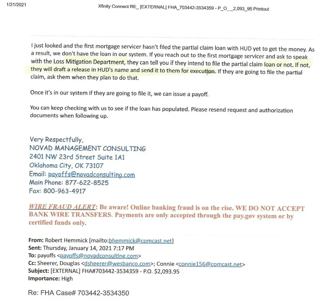 In requesting this pay off we submitted the required paperwork on January 14th. Novad for HUD has no record of claim being filed, so they cannot provide the payoff number for us to pay off the $2, 093.95.