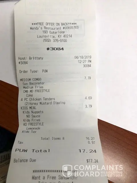 04/18/19 I went through the Wendy's #[protected] drive through at 12:27pm and ordered a med son baconator combo, 4 pc chicken tenders and a childs nugget meal for my co-workers and I. My receipt number is #3084. When I returned to work (which is approximately 3 minutes from Wendys) I was in shock when I pulled our food out of the bag and seen the condition it was in. The chicken in the 4 pc. tenders and chicken nugget meal were so dried out, burnt and hard that they could not be eaten. The nuggets were thrown in the garbage before I could get a picture but I do have a picture of the tenders attached. In addition, this was supposed to be a 4 pc tender and it was actually 3 and 1 was torn apart to make 2. Needless to say, 2 of my coworkers went without lunch today because of the poor condition of the food. I have attached a picture of the tenders and also a copy of my receipt. I would like to be refunded for the tenders and the nugget meal if possible. My email address is [protected]@gmail.com.
